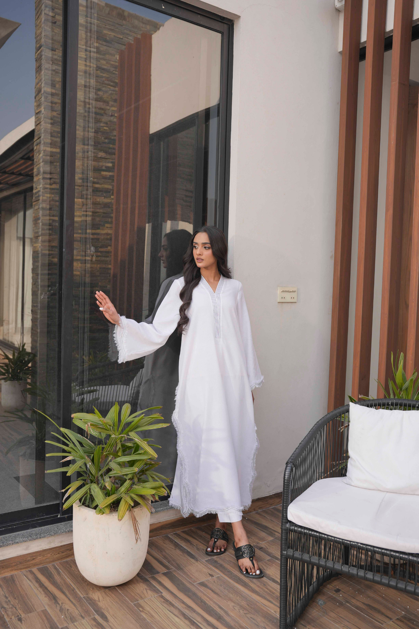 Crafted from lightweight Karandi fabric, this dress offers a soft, breathable feel with a graceful drape. The design is finished with delicate scalloped detailing and a fringed daman, adding subtle texture and an elegant, refined touch.