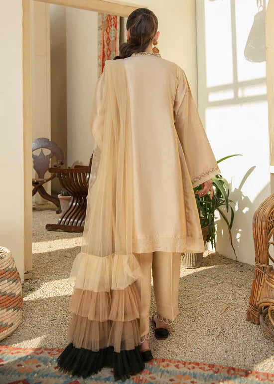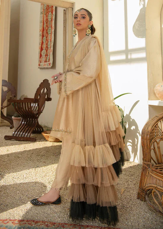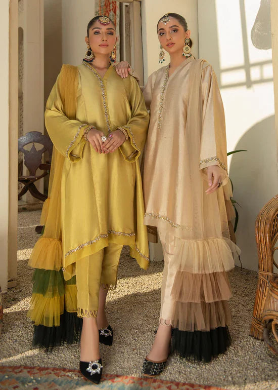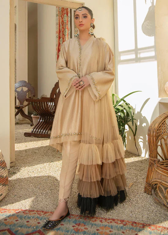Description: This raw silk set is exquisitely adorned with hand embellished sleeves and daaman with pearls, sequin and kora beautifully done on organza, the added panelled cut and a multi ruffled dupatta gives it a modern yet sophisticated look.