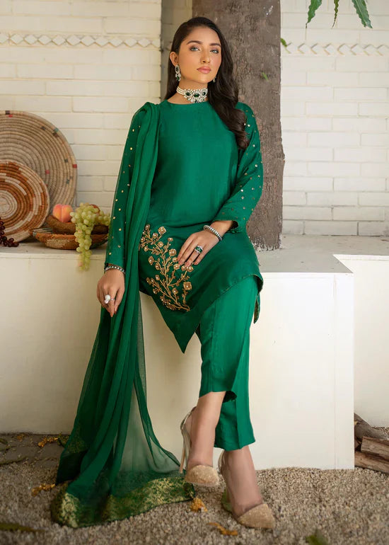 Description: This this bottle green set is exquisitely adorned with hand embellished floral motif with hints of pearls and sequin adding beautiful depth. Paired with straight pants and chiffon dupatta with tassels.