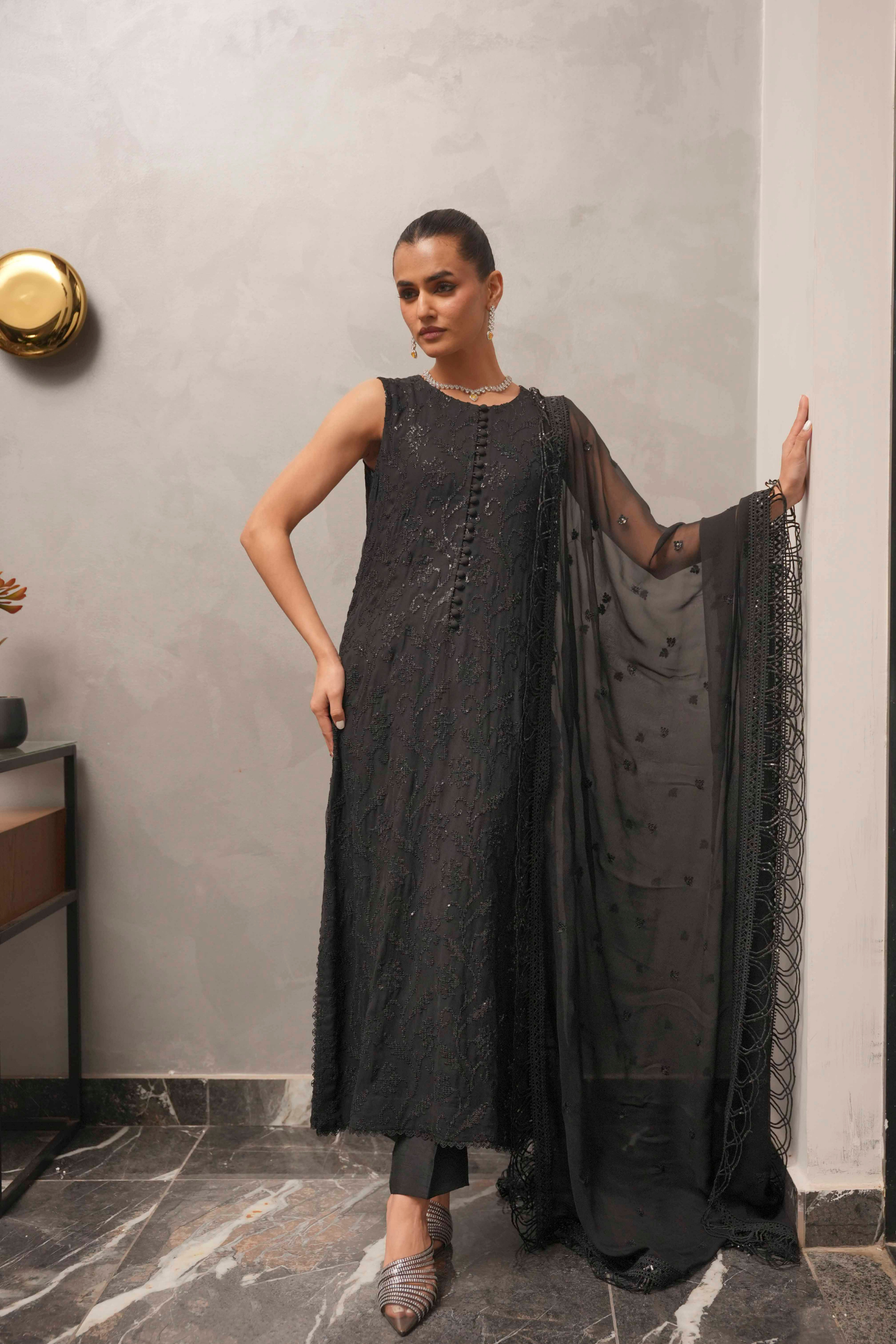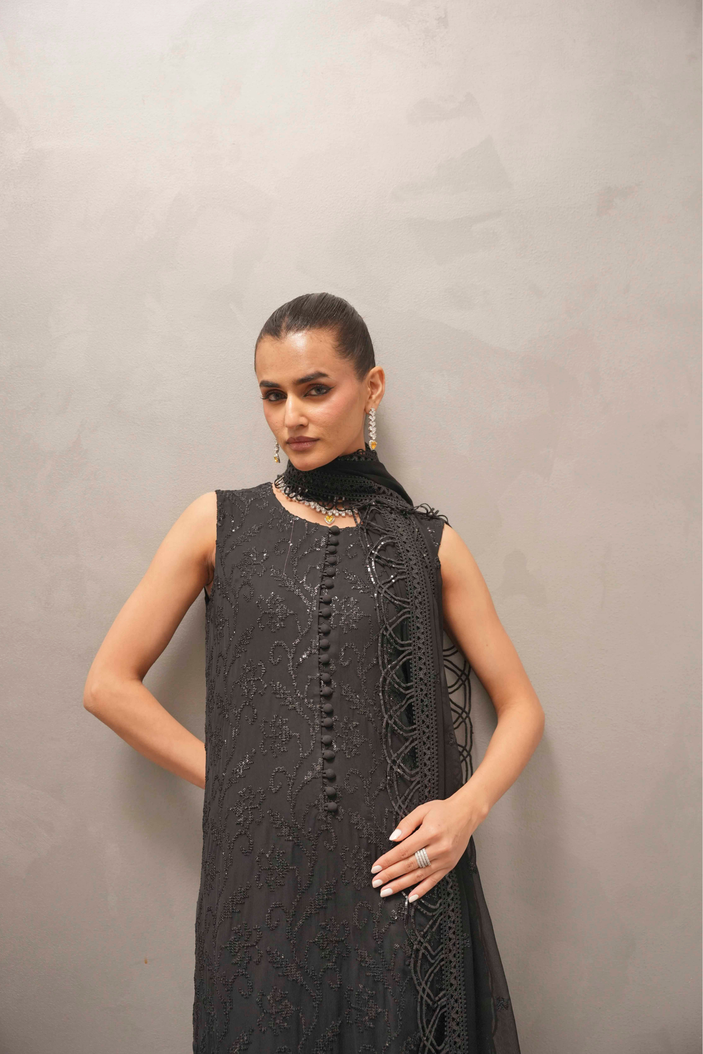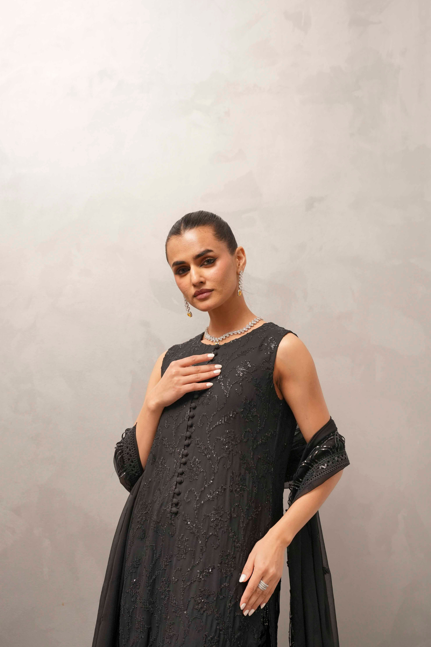 A study in classic elegance, this straight-fit set in delicate chiffon features intricate black self embroidery for a refined, sophisticated look. Effortlessly graceful, it embodies timeless charm, making it perfect for both festive gatherings and understated celebrations.