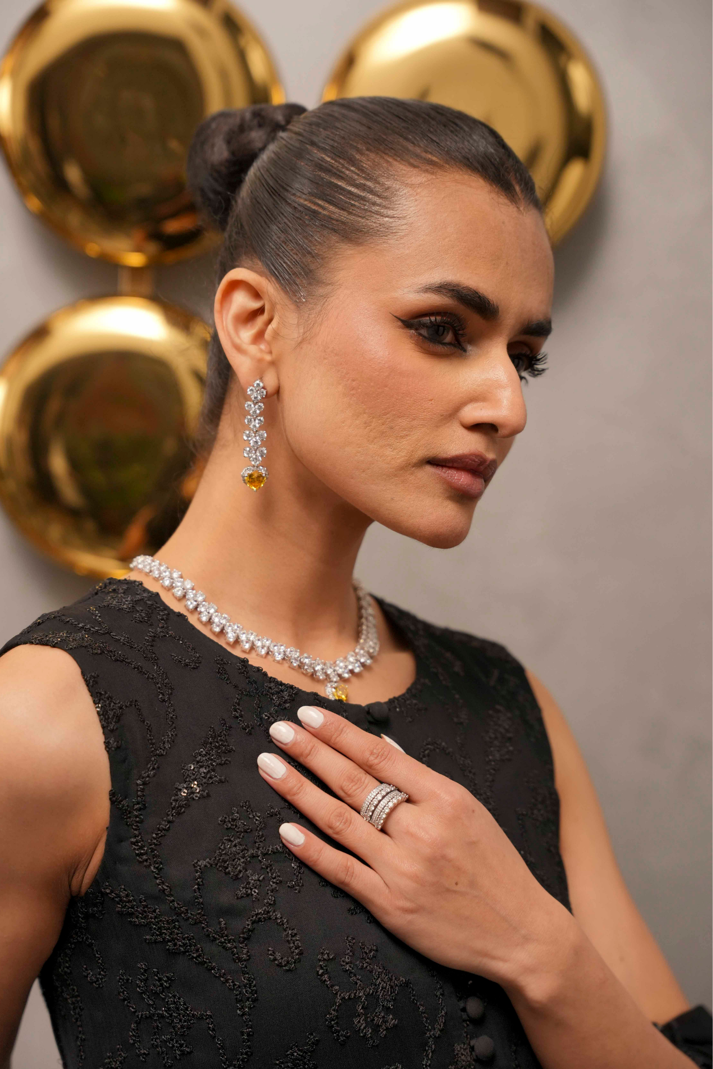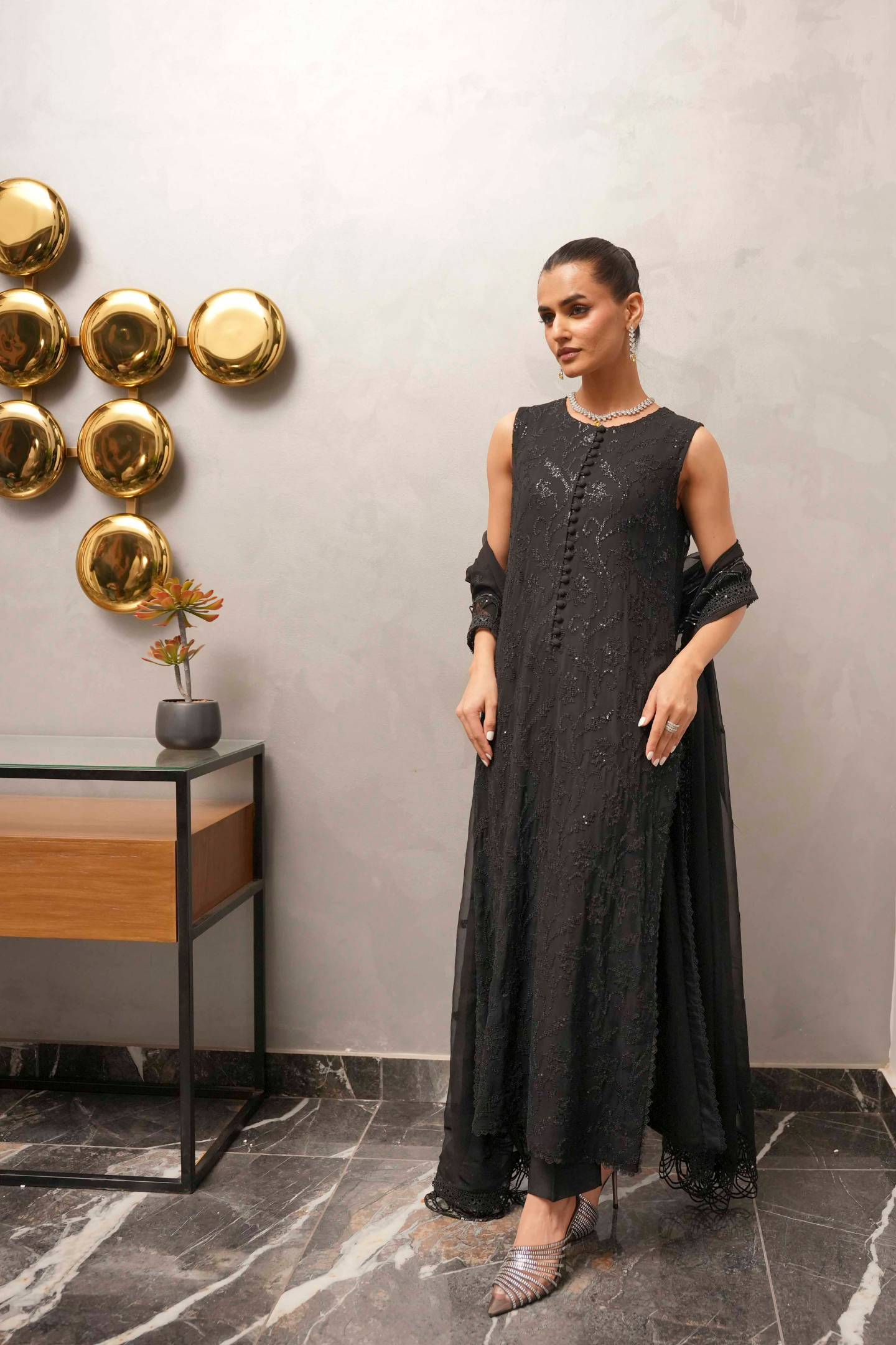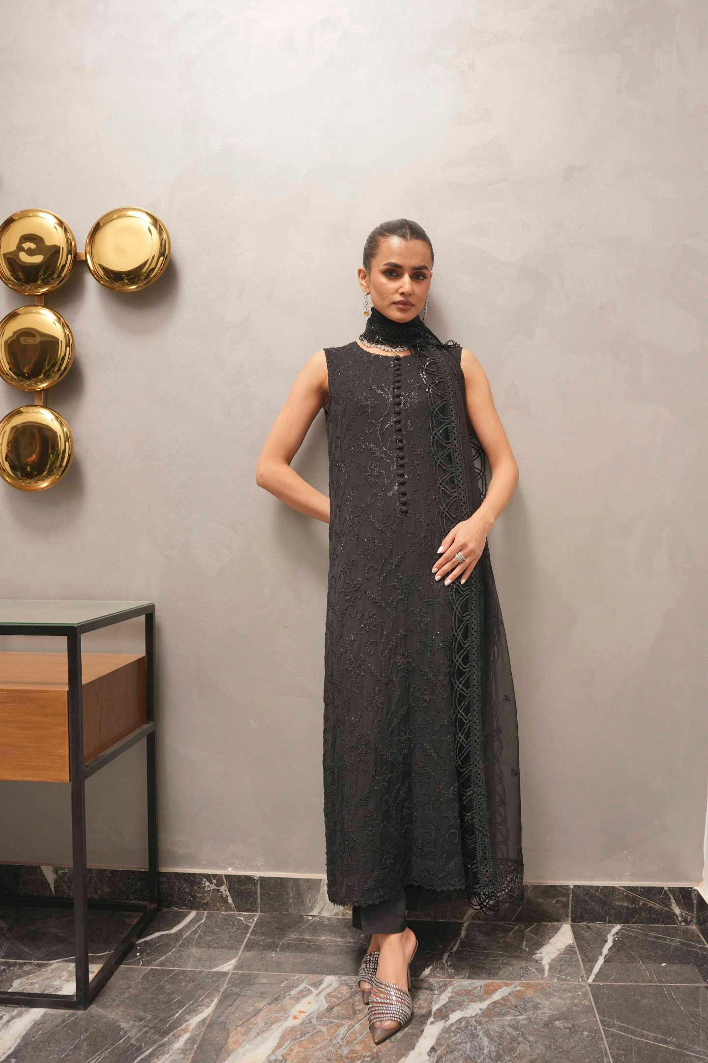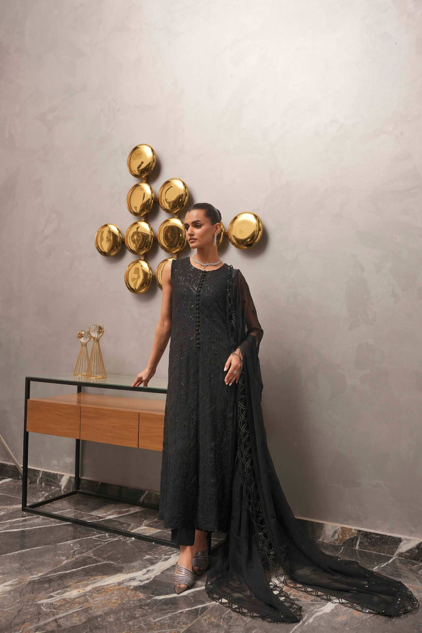 A study in classic elegance, this straight-fit set in delicate chiffon features intricate black self embroidery for a refined, sophisticated look. Effortlessly graceful, it embodies timeless charm, making it perfect for both festive gatherings and understated celebrations.