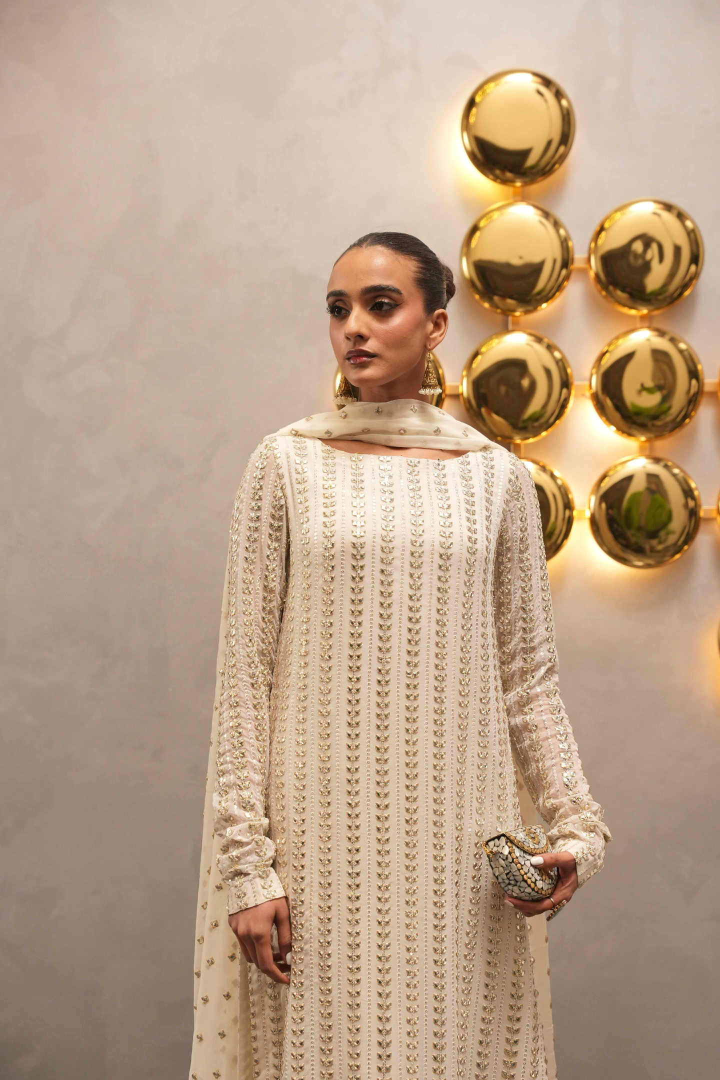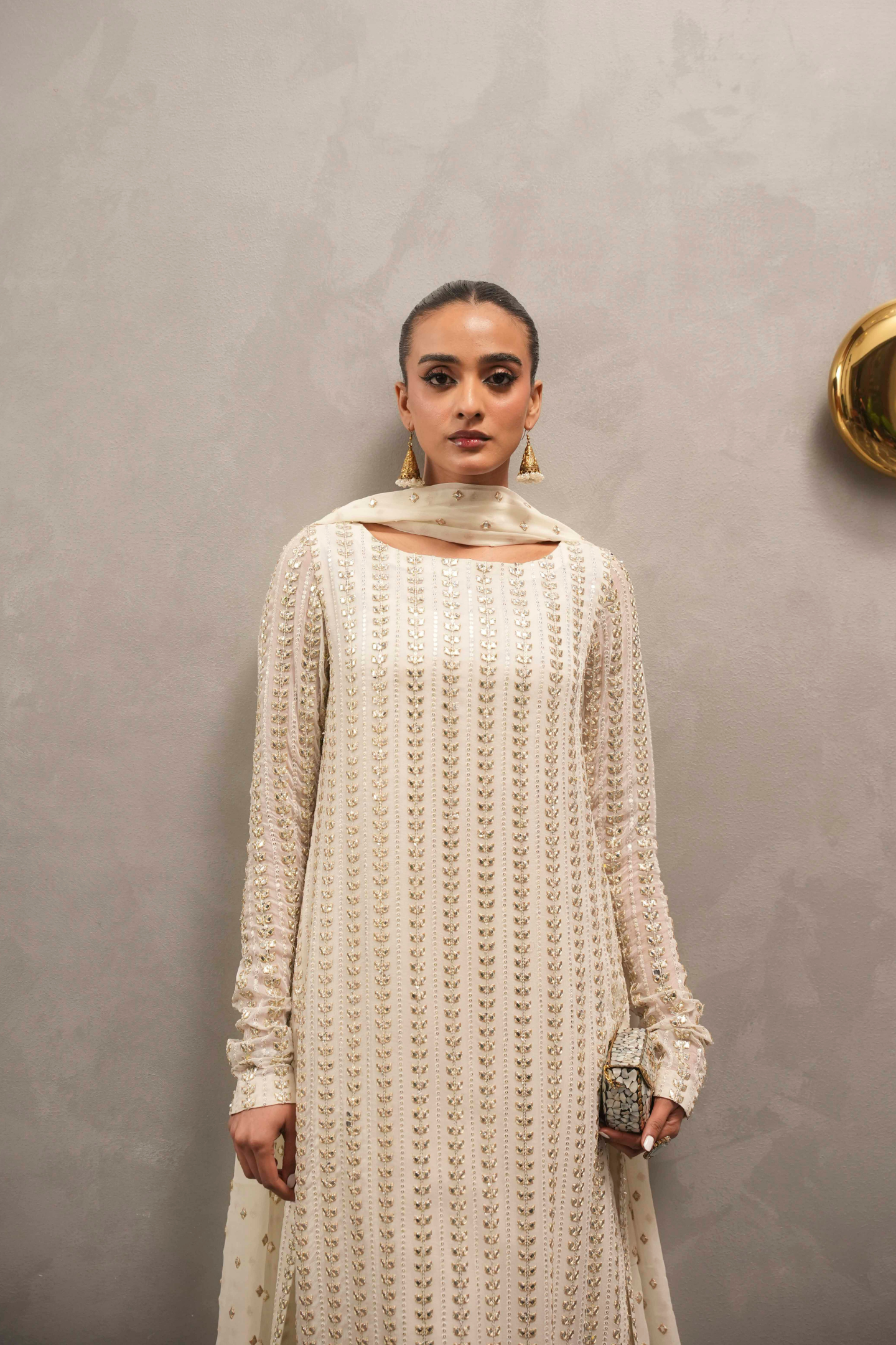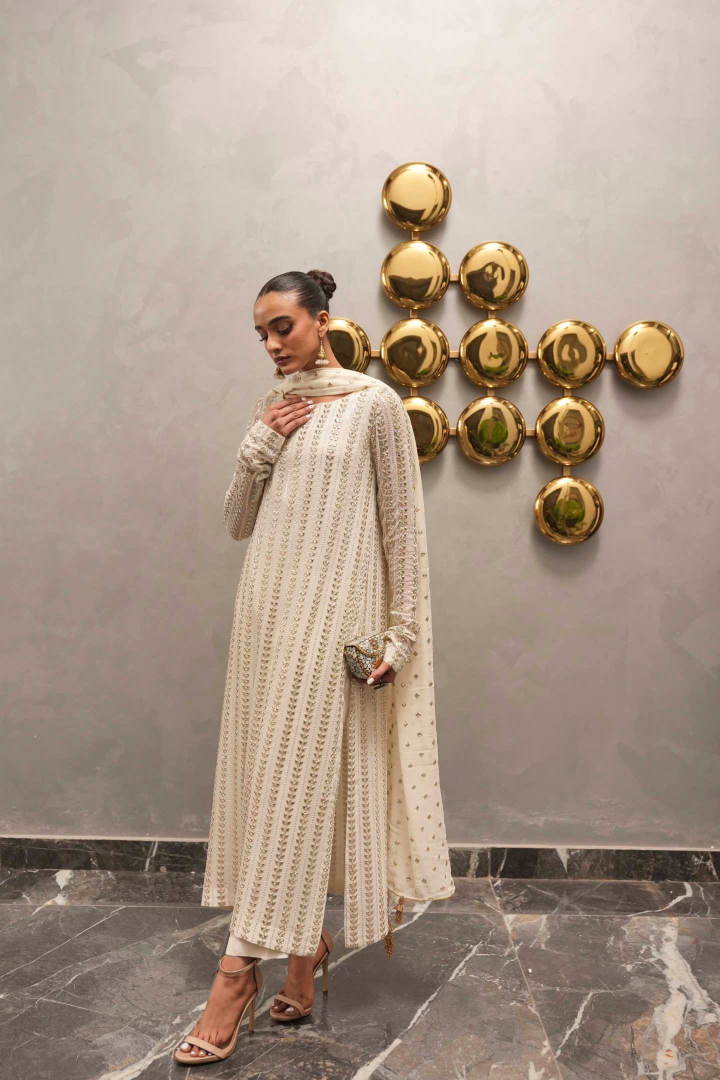 A dive into classic elegance, this straight-fit set in delicate chiffon features intricate white, gold and silver embroidery for a refined, sophisticated look. Effortlessly graceful, it embodies timeless charm, making it perfect for both festive gatherings and understated celebrations.