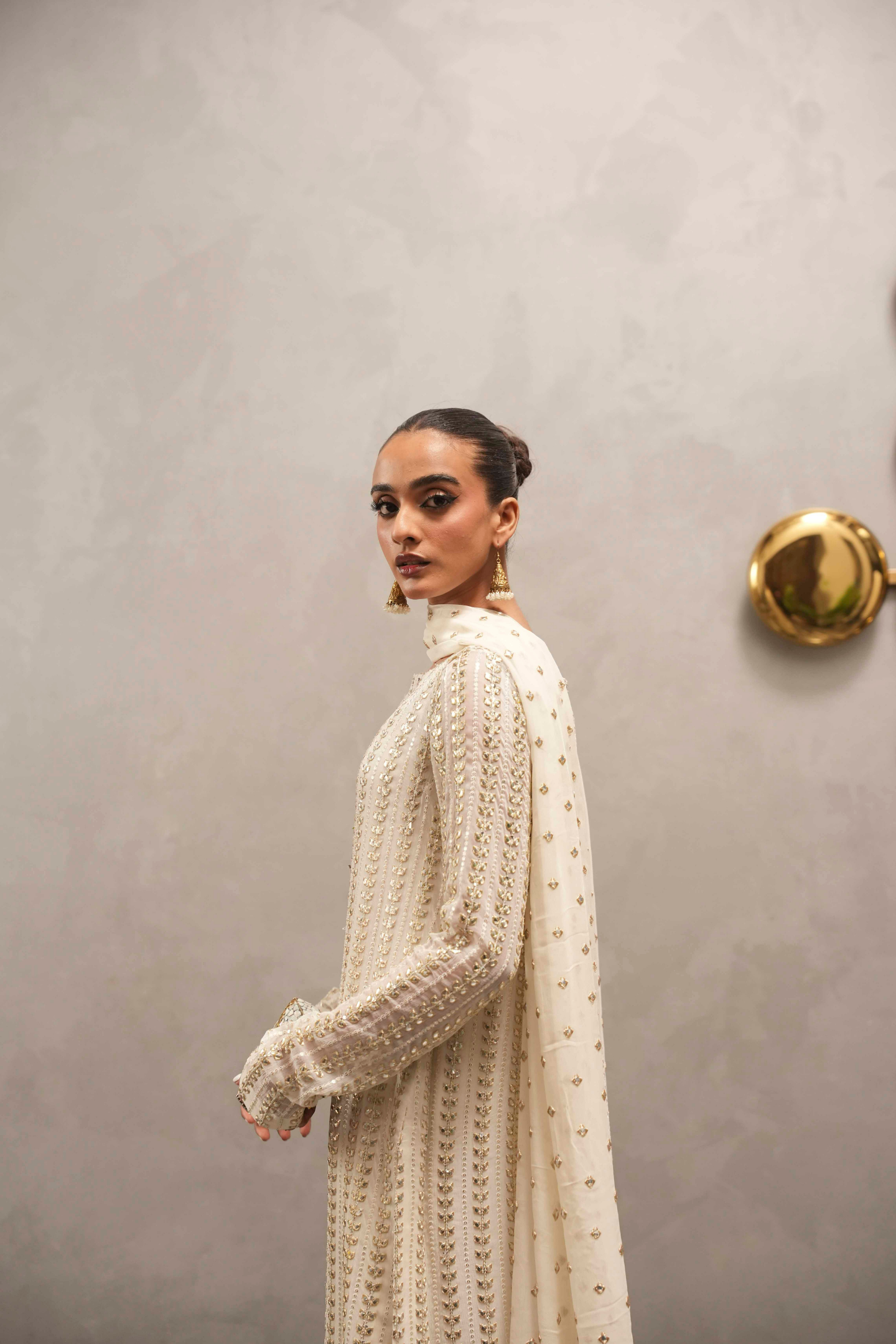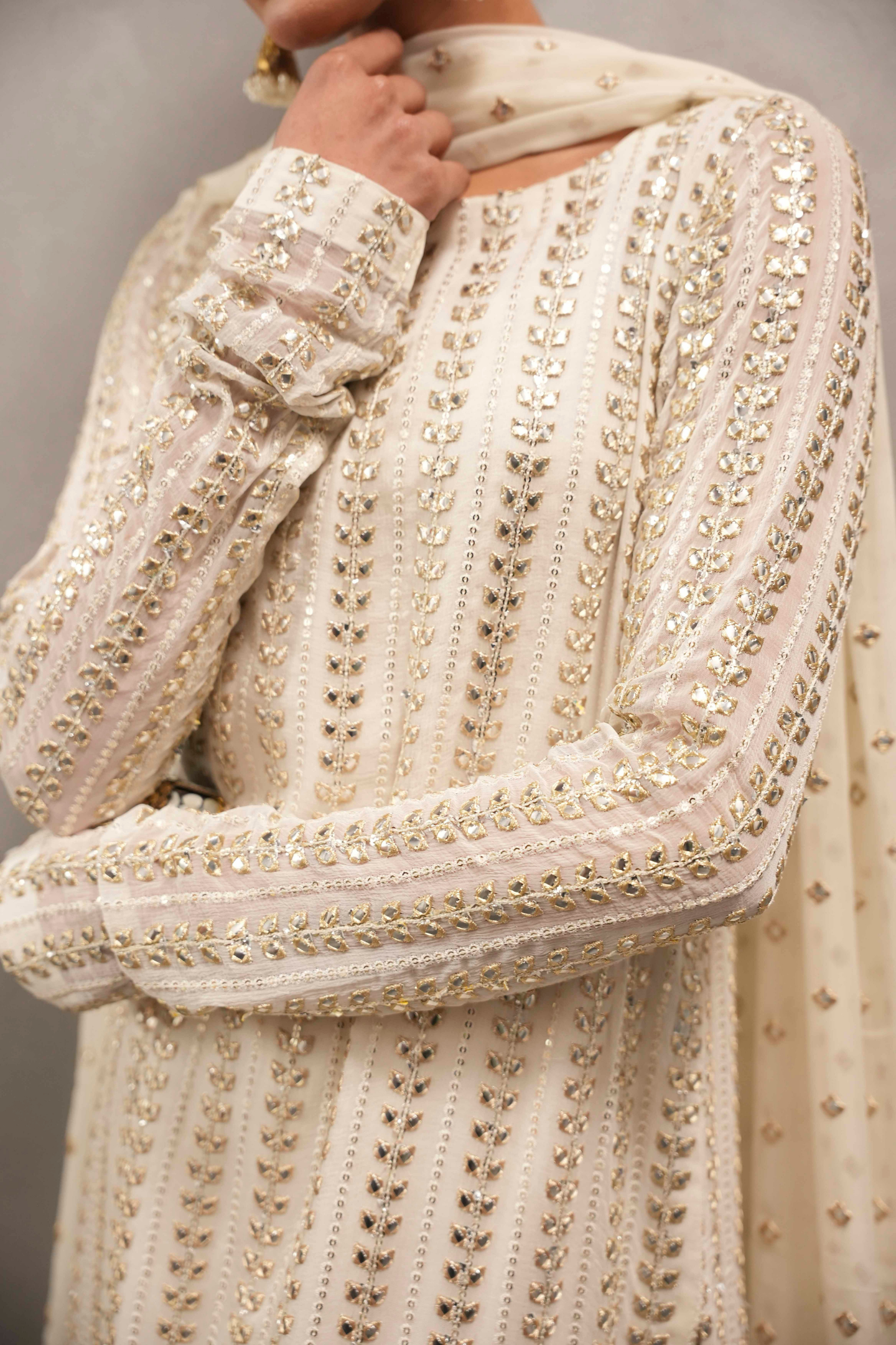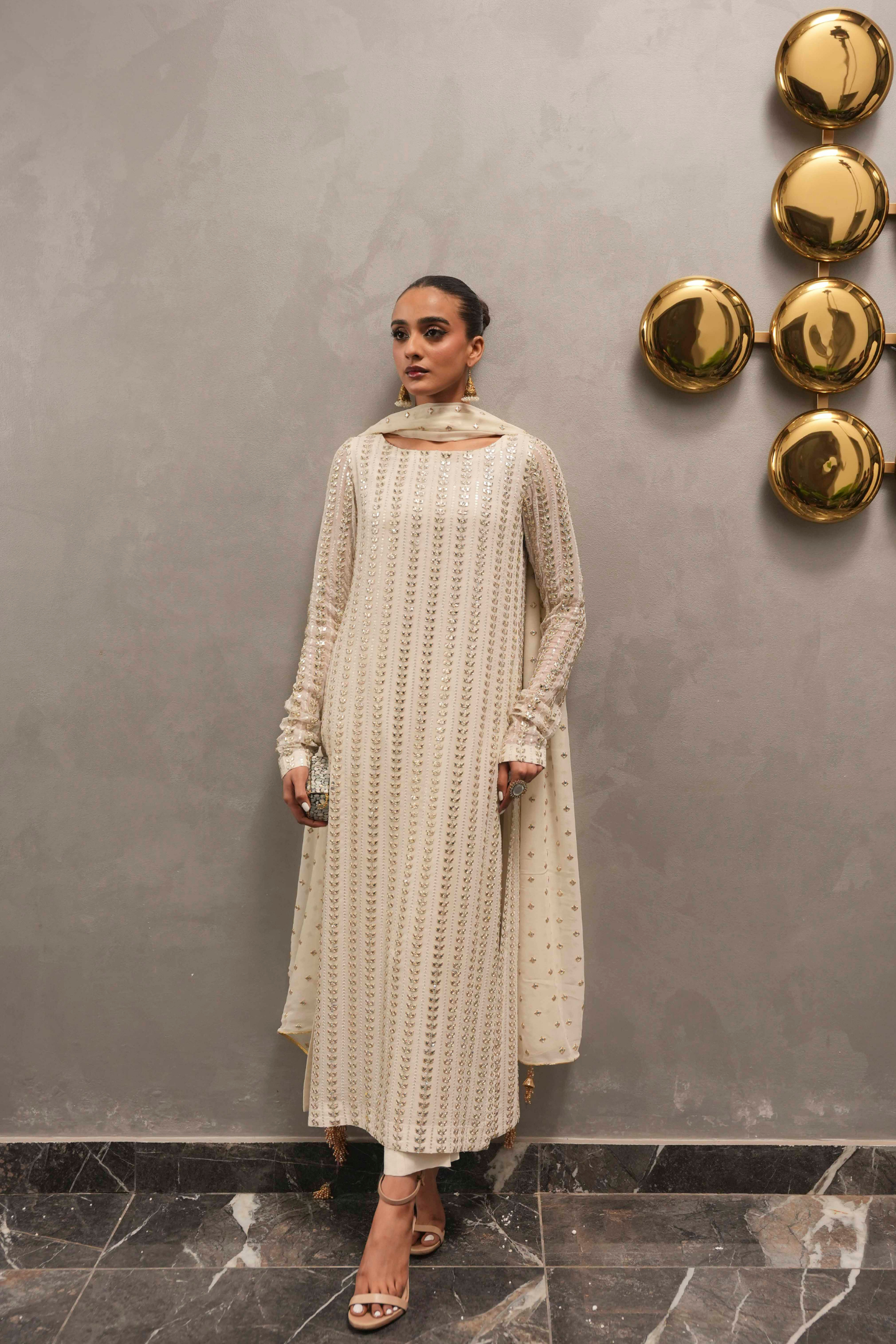 A dive into classic elegance, this straight-fit set in delicate chiffon features intricate white, gold and silver embroidery for a refined, sophisticated look. Effortlessly graceful, it embodies timeless charm, making it perfect for both festive gatherings and understated celebrations.