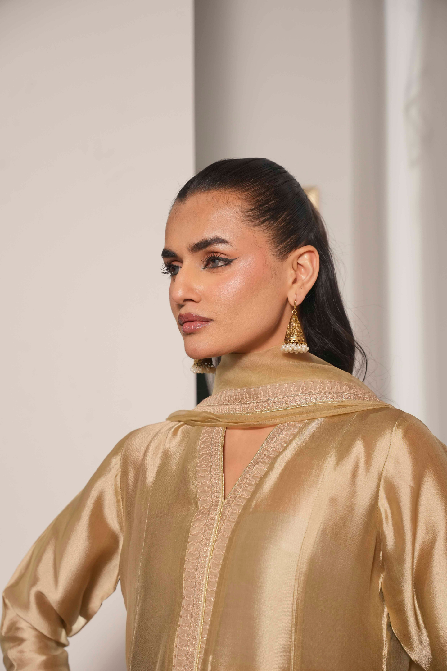A study in refined elegance, this piece showcases intricate Noorey embroidery with subtle gold accents. The silhouette flows gracefully, creating a classic, enduring charm that transcends trends—perfect for festive and special occasions.