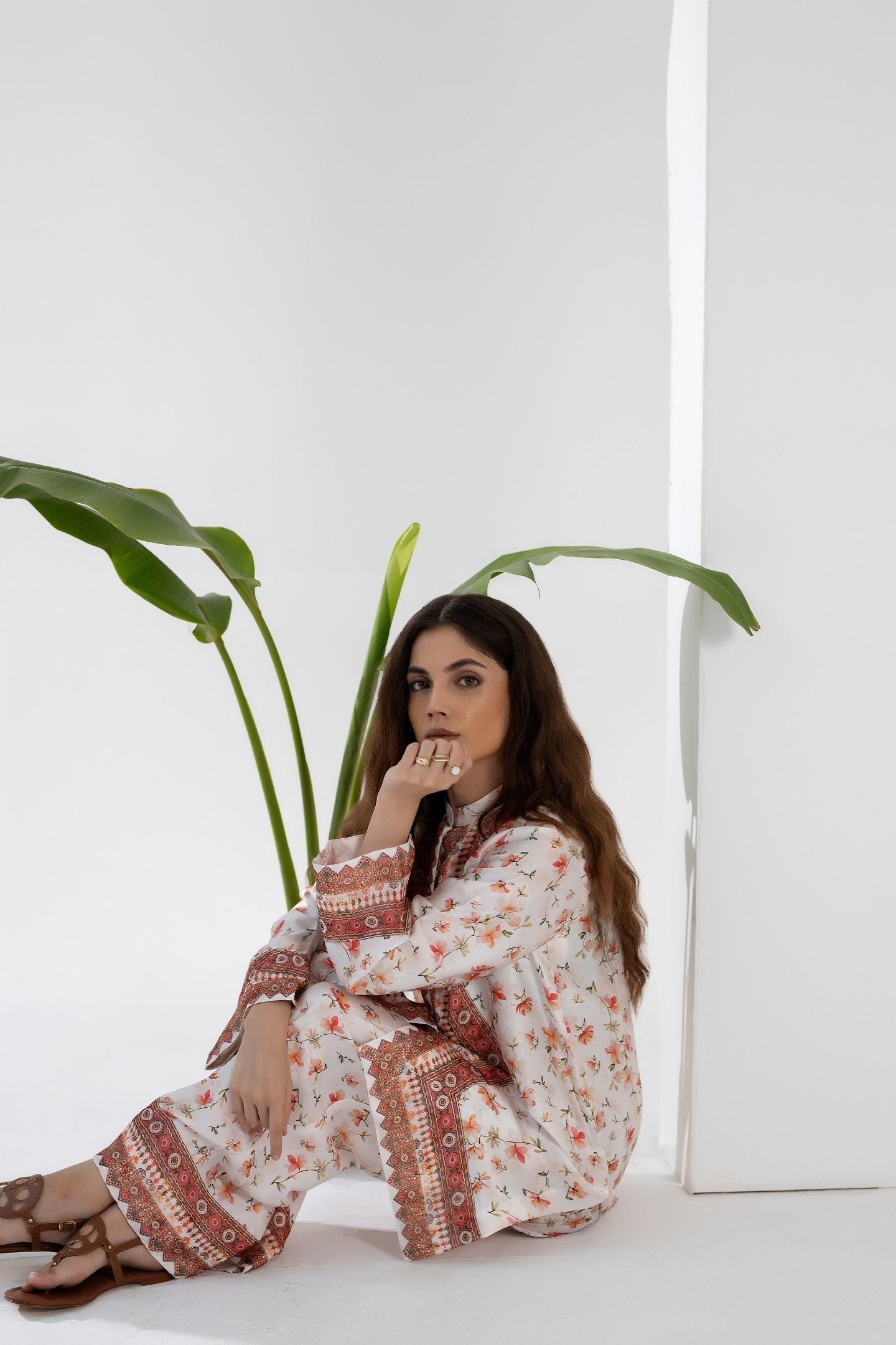 Off-white silk coord with peach and light brown floral print, detailed with elegant borders. A soft yet refined set perfect for all-day wear.