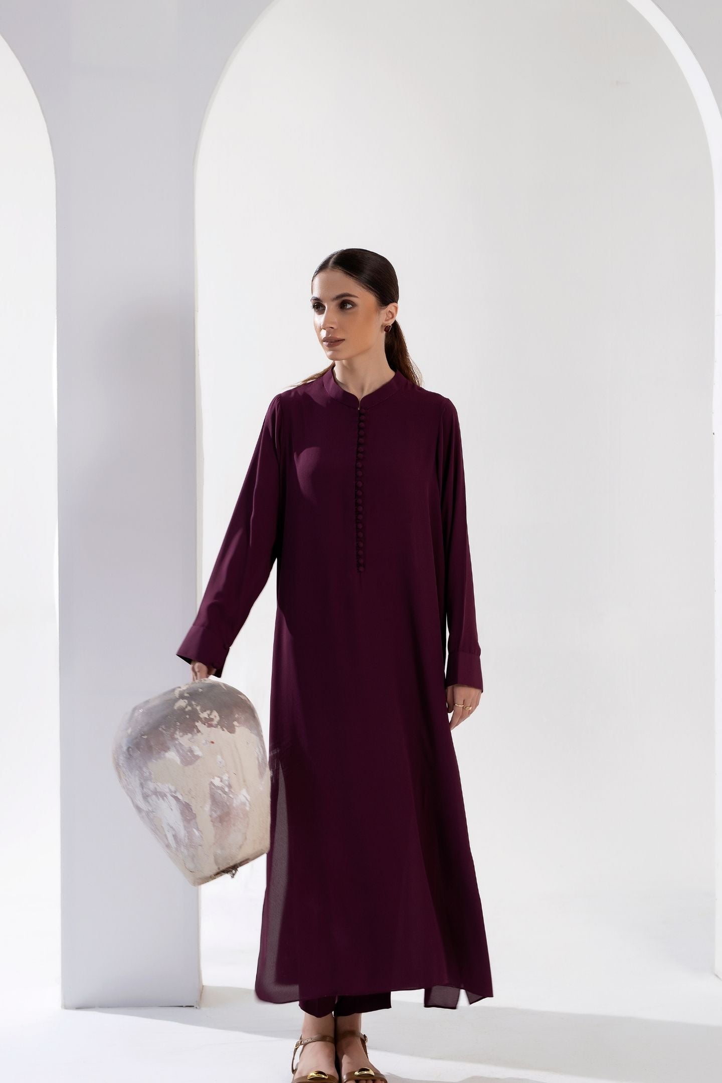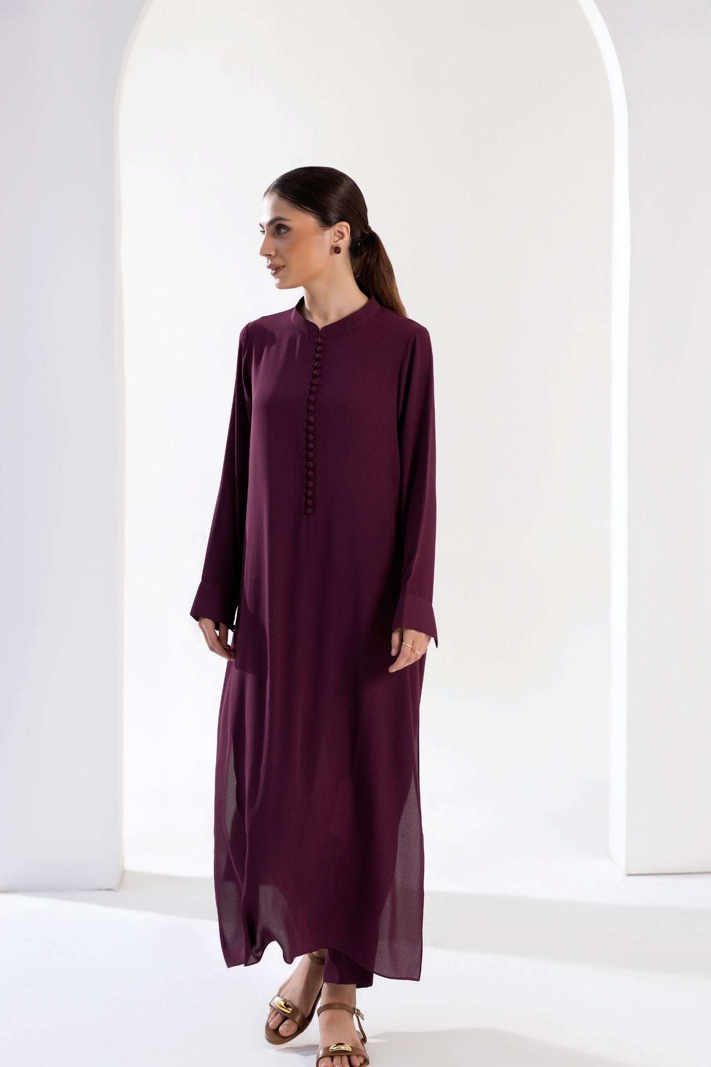 Rich in color and timeless in design, this long-length shirt in deep plum features a sleek button-down front for effortless sophistication. Its versatile silhouette makes it perfect to style as a coord or wear as a statement standalone piece, transitioning with ease from daywear polish to evening charm.