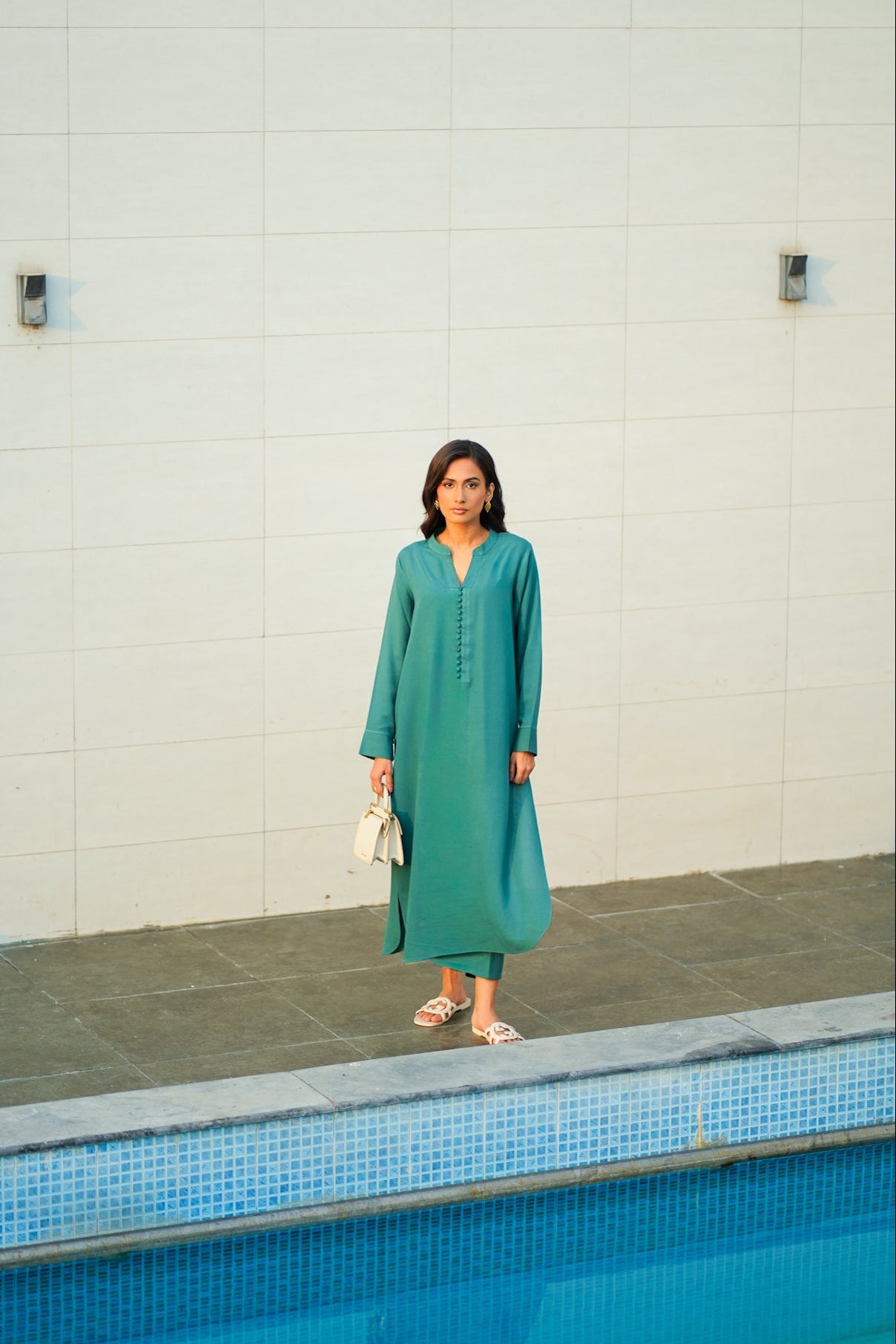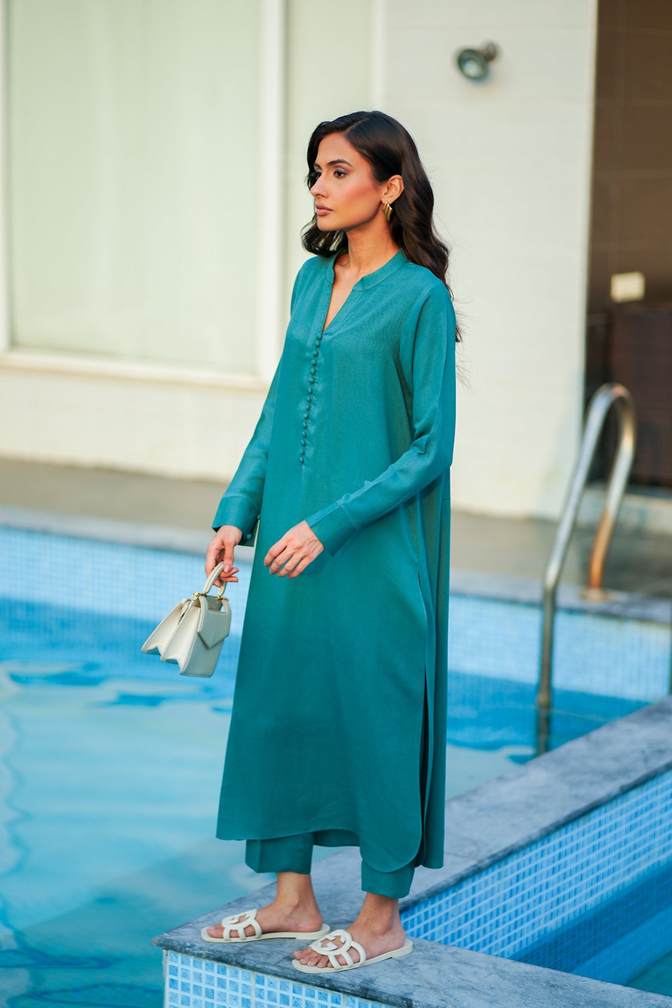 Step into elegance with this teal karandi co-ord set, featuring a sleek button-down kurta with a modern neckline and matching straight pants. Effortlessly chic and perfect for any occasion.